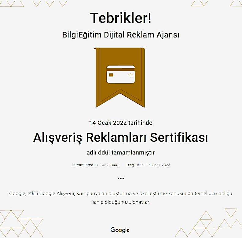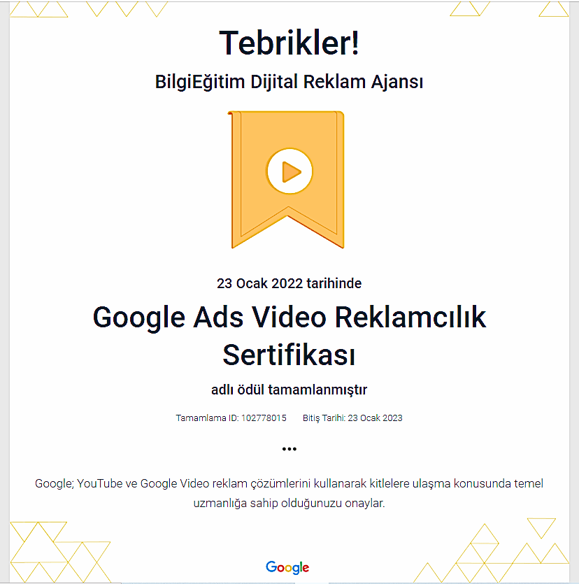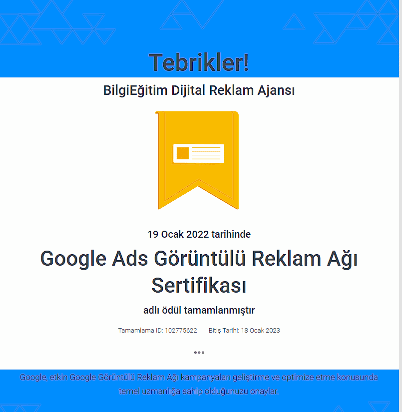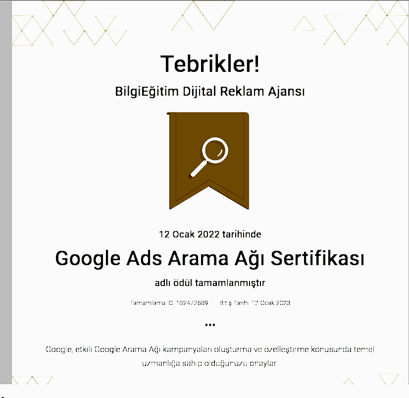 Google'ın reklamcılık platformu olan Ads'in temel ve ileri düzey özelliklerinde uzmanlığınızı gösteren ve bireylere Google tarafından verilen bir yetkinlik belgesidir. Bu sertifika, Google'ın ilgili kişiyi bir dijital reklamcılık uzmanı olarak onayladığını gösterir.